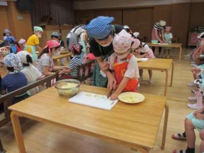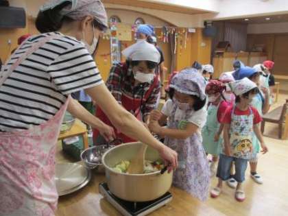 今日は,いよいよ調理をします。お母さん方がお手伝いをしてくださり,みんなで野菜を切ったり,炒めたりしました。お家でしていることを思い出して「お家でもお手伝いしてるよ」「これは切ったの初めて」など話をしながら楽しんでいました。そして,ぐつぐつお鍋のにおいがしてくると「おいしそうやな」ととっても楽しみにしていました。カレールーを入れると,「もうできたんちゃう?」「食べたいな」とみんなで食べることをとっても楽しみにしていました。「おいしくなあれ!」とみんなでパワーを送ったカレー。最後の仕上げはお母さんたちにお願いして,出来上がりを楽しみにしていました。