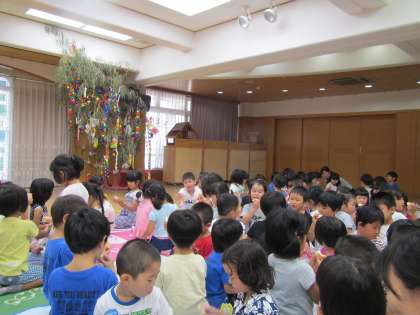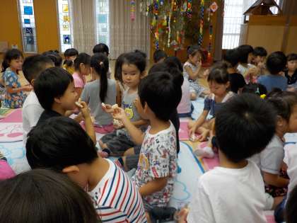 七夕の集いでは,たなばたさまを歌ったり,ブラックシアターで七夕のお話を聞いたりして楽しみました。ブラックシアターが始まると,「星が光ってる!」「彦星様は働かなくなってしまったんか…」と七夕のお話によく耳を傾けていました。お星さまからのプレゼントとして,星の形をしたお菓子をもらうと,「おいしい」といって嬉しそうに食べている姿がありました。