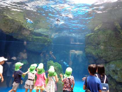 7月23日・24日,5歳児ゆり組・すみれ組が幼稚園でお泊り保育をしました。1日目は水族館に観光バスに乗ってでかけ,たくさんの魚やくらげを見たり,イルカショーを見たりしました。