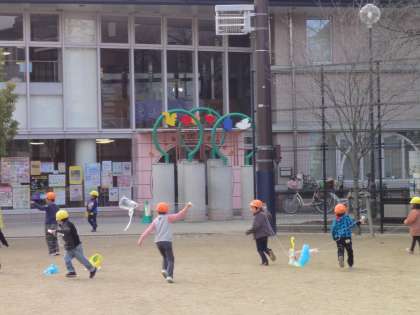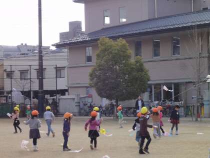 朝から小雪がちらつく寒い日ですが、4歳児と3歳児は公園で凧揚げをして遊びました。