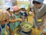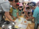 エプロン,三角巾,マスクと用意ができたら,いざカレーづくりの開始です。自分たちでどの順番でつくっていくか相談し,野菜を洗うところから切ったり,炒めたり,煮たりするところまで,全てグループの友達と力を合わせてつくっていきました。「おいしくな〜れ,おいしくな〜れ」と魔法をかける声も聞こえてきて・・ぐつぐつ煮ていくと美味しそうな匂いが広がっていきました。