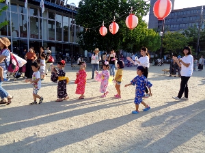 竹間公園で毎年恒例の竹間夏まつりに,PTAさん、おやじの会はたこせんや焼きそばの屋台で,子どもたちは『中京もえぎ音頭』を踊って参加しました。