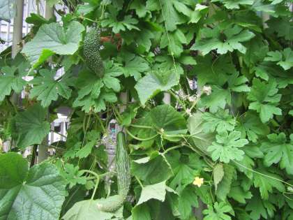 園庭の畑では,緑のカーテンが日に日に生い茂り,元気なゴーヤやキュウリの赤ちゃんがたくさん実っています。