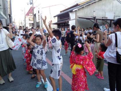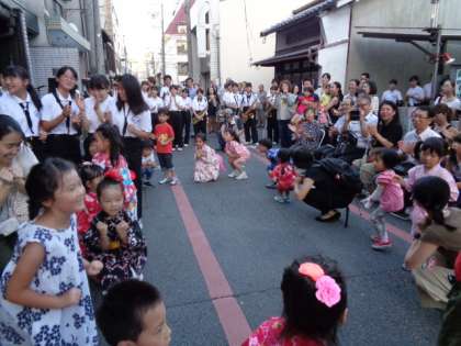 8月25日に毎年恒例の姉小路行灯会があり、御池中学校の吹奏楽部の演奏を聴いたあと、『中京もえぎ音頭』を地域の皆様が見てくださっている所で在園の子どもたち、卒園したお兄さんやお姉さん、そして先生たちで踊りました。御池中学校の吹奏楽部の中にも中京もえぎ幼稚園の卒園生もおり、一緒に踊ることができました。