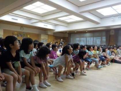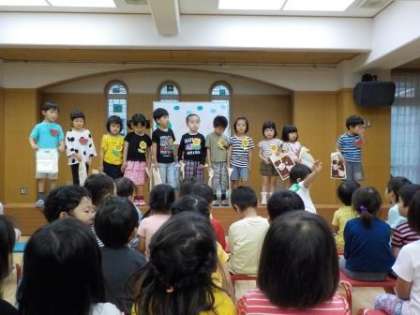 今日は8月生まれの誕生会でした。12人の子どもと1人の職員をみんなでお祝いしました。夏の食べ物や花,虫などで誕生児を紹介し,歌と言葉のプレゼントをしました。
