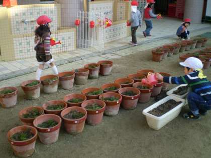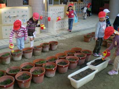 自分の分だけでなく,隣のクラスの友達の植木鉢に水やりを始める子の