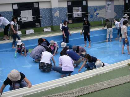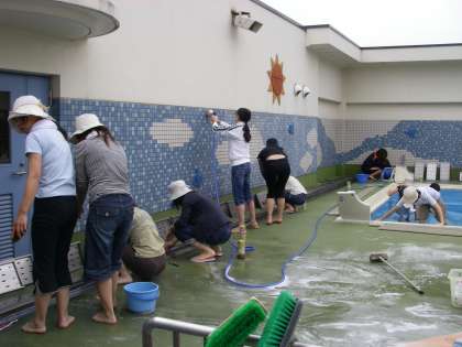 PTAさんが屋上のプールを清掃してくださいました。50数名のご参加をいただき1時間ほどですっかりきれいにしていただきました。プールを見た子どもたちの笑顔と歓声は6月16日のプール開きを待ちきれない様子です。例年のことながら本当にありがとうございました。引き継いでいっていただいていることを有り難く思っています。