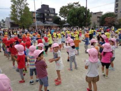 体操「エビカニクス」では,年長の代表の子どもたちが前に出て,みんなのお手本となってくれました。子どもたちは「エビ!カニ!」のところが大好きです。