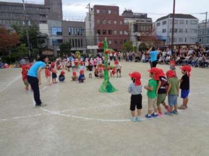 3歳児の競技は「みんなであそぼう」と「おおきくなあれ」が合体したスペシャルバージョンで行いました。ジャンプ台やトンネル,おばけにタッチと体を動かすことを楽しんだあと,みんなで作ったトマトを収穫して「キャベツはキャッ」で思い切り走り回りました。