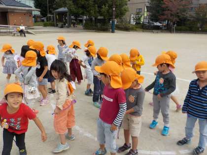 今日は4歳児たんぽぽ組ひまわり組でソーラン節としっぽ取りを楽しみました。ソーラン節は,運動会で5歳のゆり組さんすみれ組さんが踊っている姿を見て以来,憧れの気持ちで,みんなが大好きな踊りになりました。今日もソーラン節の音楽が鳴り始めるとみんなが集まってきて,「はっ!」と勇ましく掛け声をかけながら踊っていました。「ここでは動くんやで」と教えてくれたり,それぞれお気に入りの部分があるようです。