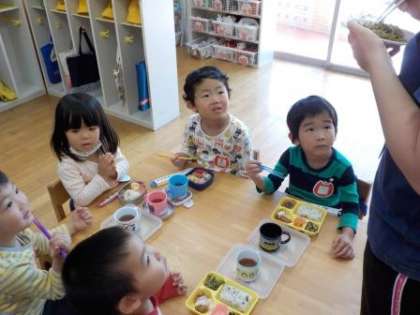 普段あまり食べたことのないつるにドキドキの子どもたち。「どんな味なの?」と期待していました。食べた感想は,「なんか甘い味がする」,「なんかかりかりしてて美味しい」,「しゃきしゃきしてる」などと言っていました。調理した職員が様子を見に来た時には,子どもたちは「美味しい」と口ぐちに伝えていました。そしてお弁当を全部食べ終わった後で何度もつるをおかわりするほどにお気に入りになった子どももいました。