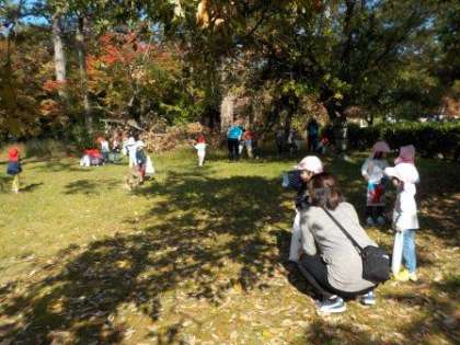 交通安全に気を付けて友達と手をつないで歩き,京都御苑まで無事に着きました。ドングリのたくさんある場所まで行き,約束事をした後,早速ドングリや松ぼっくりや色づいた落ち葉などを拾い始めました。「こっちにいっぱいあるよ〜」「磨いたらピカピカ光るドングリだよ」と一生懸命拾っていました。