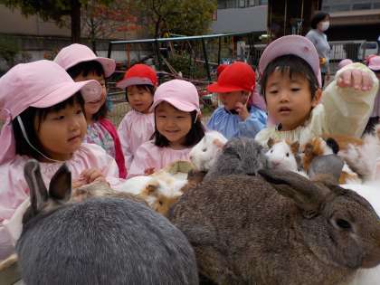今日は,朝から竹間公園や幼稚園の園庭に動物たちがたくさん来てくれ,「やぎがいた!」「うさぎもいるかな?」とみんな楽しみに登園してくる姿が見られました。