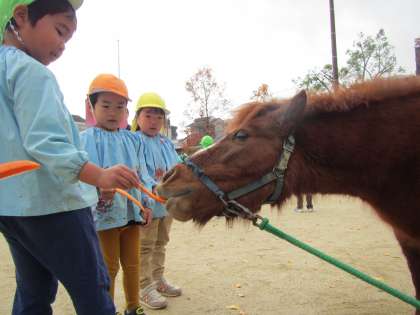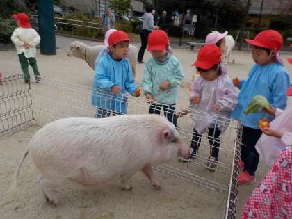 ポニー動物園の飼育員さんから,動物と仲良くなる方法やかかわり方などの大切なお話を聞いて,さっそく学年に分かれて公園と園庭の動物たちのところに遊びに行きます。はじめは,恐る恐る近づいていた子どもも,先生や友達が優しくなでたり,ごはんをあげたりするのを見て,少しずつ表情が和らぎ,「可愛い」「にんじん食べてくれた!」「ぶたさんは芋が好きみたい」「やぎさんは柿も食べる!」と,自分の好きな動物を見つけて喜んでいました。慣れてくると,ヘビを首に巻いたり,ニワトリを抱いたりする子どももいました。年長組は,最後に動物たちを籠に入れてあげたり,ヤギをトラックに誘導したり,柵を片付けたりのお手伝いもしました。動物たちと仲良くなって大満足の一日でした。