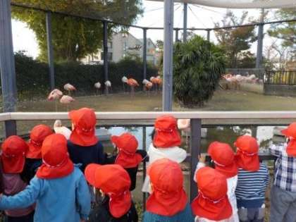 動物園では,クラスごとにキリンやゾウ,ヘビやトラなど,近くでゆっくりと見ることができました。水に足を付けているフラミンゴを見て,「寒いからお風呂に足いれてるんかな」と言ったり,オラウータンの親子を見て「お母さんと遊んでるんや」と言ったりと,子どもたちなりに動物の気持ちを考えたり,動物の迫力に驚いたりととても楽しんでいる様子でした。