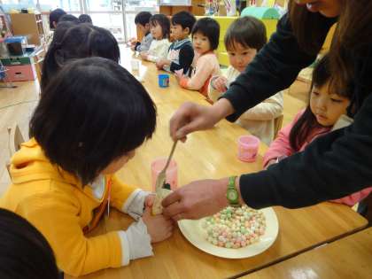 3歳児クラスでは,色紙で紙コップを折り,その中に雛あられを入れていただきました。先生に雛あられをもらうのを待っている間,自然と