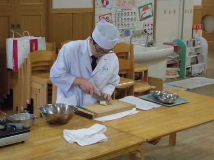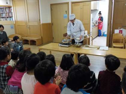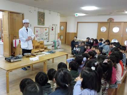 学校運営委員会「もえぎティンクル」の方のご協力の元,幼稚園で育てていたほうれん草・水菜・菊菜・大根・サツマイモを使って和食をつくって頂きました。実際に板前をされているお父さんが来てくださり,子どもたちの前で出汁の取り方やお料理の仕方を実演してくださり,とても興味津々な子どもたち。