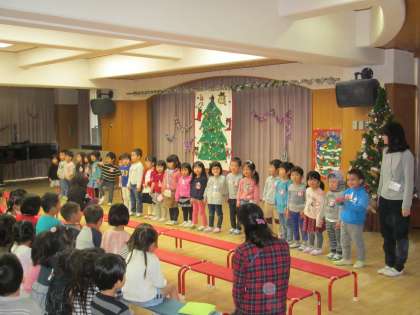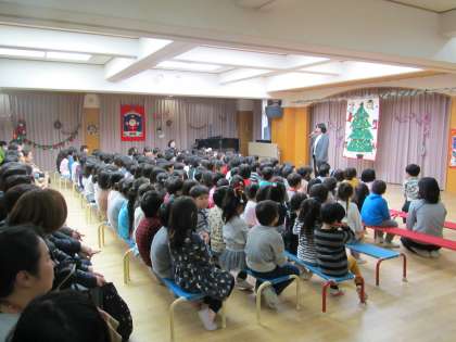 今日は,2学期の終業式がありました。いっぱい遊んだり,いろいろな行事を経験したりした2学期,身体だけでなく心も強く大きくなってきたねと,園長先生からのお話をしてもらい,じっと聞く姿がありました。また,冬休み中の生活や年末年始の挨拶についても話を聞きました。最後は,新年元気に会えるのを楽しみに,「よいお年を」と,みんなで気持ち良く挨拶をしました。その後,各クラスや学年で歌い親しんできたクリスマスの歌をお家の人に聴いてもらいました。