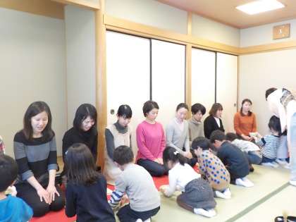 ゲームでは保護者の方々がみんなが楽しめるものを考えて下り,友達や保護者の方と一緒に楽しみました。コサージュづくりでは,修了式の日につけるお花を,子どもたちが選んで,保護者の方と一緒にコサージュにしました。それぞれ,一人一人の特別なコサージュができました。そして,親子お茶会では,今までお茶会で習ってきたことを見てもらいました。子どもたちがお茶をたてておもてなしです。おいしく頂いてもらいとても嬉しそうでした。