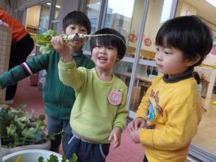 収穫した大根は,他にも幼稚園で育てたブロッコリーや二十日大根と一緒に,味噌茹でにしていただきました。職員室の方にもお世話になり,みんなで育てた野菜はとっても美味しくなりました。子どもたちは,「美味しい。」「ちょっと甘い」「苦いところもある」などと言いながら味わっていただいていました。またお弁当を頑張って食べ,「全部食べたからおかわり!」と急いでおかわりに来る姿もあり,中には3回もおかわりをする子どももいました。みんなで育てた野菜は,やはり特別なようで,野菜が苦手な子どもたちも「食べてみたら美味しかった」と言って完食する子どももいました。