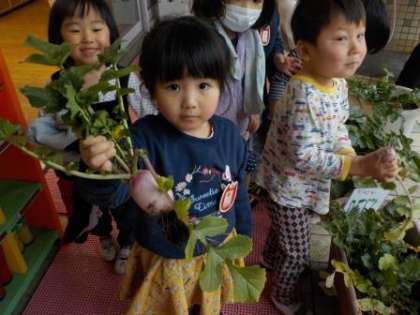 3歳児ちゅうりっぷ組・もも組では,本日,幼稚園で育てた大根を収穫しました。なかなか抜けず,「重たい…」とつぶやく姿や,抜いた大根を見て「これは細長い!」「大きいね。」と様々な形があることを感じる姿もありました。