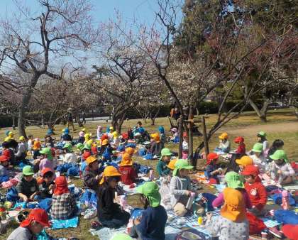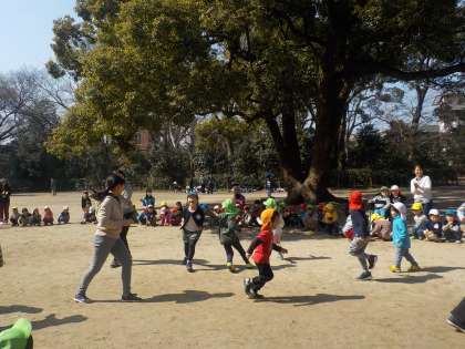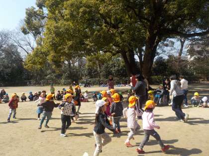その後は,温かい日差しの下,「おいかけっこ」や「だるまさんが転んだ」等の遊びをしたり,お花を拾って集めたり,色々な形の石を見つけて遊んだり,自然の中でいっぱい体を動かして楽しみました。