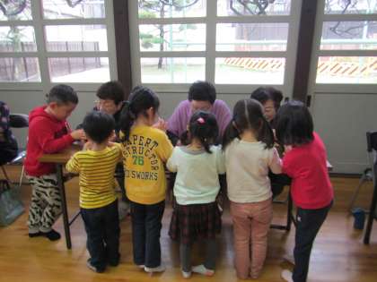 今日は地下鉄に乗って,元明倫幼稚園舎まで,明倫社会福祉協議会の地域の方との交流にたんぽぽ・ひまわり組のみんなで行ってきました。初めて行く場所に,どんな所かな?どんな方たちが待ってるのかな?とワクワクしながら出発しました。園舎に入ると,さっそく地域の方の歌声が聞こえてきたり,自分たちの幼稚園とは違う昔の雰囲気に少しどきどきした表情も見られましたが,優しい笑顔と挨拶で出迎えていただき,安心した様子でした。