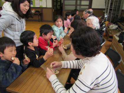 まず地域の代表の方が今日のお楽しみの内容を話してくださり,期待しながらじっと聞く姿が見られました。その後みんなから,中京もえぎ幼稚園の歌と「しあわせなら手をたたこう」「頭のうえでパン」の3曲の歌をプレゼントしました。初めて聴いていただくお客さんを前に,いつもよりはりきって元気いっぱい歌う姿がとても可愛らしかったです。手遊び歌は,地域の方も笑顔で一緒に歌ってやってくださり,とても嬉しそうでした。次に,各テーブルに分かれて顔を合わせて交流をしました。この日のために,可愛いイヌの折り紙を折って準備をしてくださっていて,子どもたちは自分の好きな色や形のイヌを選び,好きに顔や模様を描いたり色を塗ったりし,できた物をお土産にいただき,大満足の様子でした。そしてその後は,84歳のおじいちゃんのピアノ演奏に合わせて,みんなで「うれしいひなまつり」を大合唱しました。最後に,一緒に遊んだ地域の方と顔を合わせながらおやつを食べた際には,地域の方の優しい雰囲気や楽しいお話に,子どもたちはすっかり安心し,自然と笑顔があふれ,ほっこりと素敵な時間を過ごすことができました。