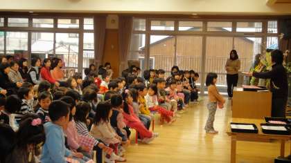 3学期の終業式では,修了式の年長さんのように,ひとりずつ園長先生に記念品をいただきました。