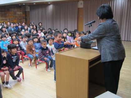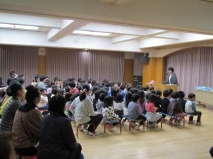 年長組が卒園して寂しさもありましたが,年中・年少組だけで元気いっぱい幼稚園の歌を歌う姿や,園長先生の話を静かに座って聞く姿に,もうすぐ大きい組さんという頼もしさや一年の成長を感じました。一人ずつ担任の先生から名前を呼んでもらい,修了児のように,園長先生から進級記念品を前に出て受け取りました。その姿も一人一人とても誇らしげで嬉しそうでした。次にみんなで会う時には,いよいよ一つ大きい組さんです。この一年間の経験を力に,来年度もいっぱいいっぱい楽しいことを見つけて大きくなっていってほしいと思います。一年間,幼稚園教育にご協力いただき,ありがとうございました。