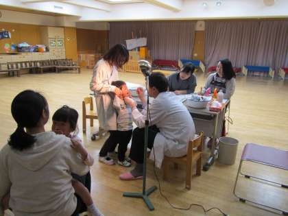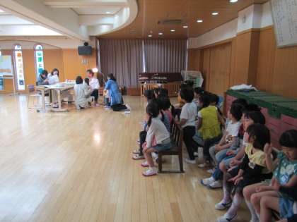 5歳児年長組と3歳児年少組と交互にしながら,自分のクラスや前のクラスの友達が受けている姿を見て待っていました。5歳児4歳児は,去年やこれまでの経験があり,ドキドキするけれど,しっかりと自分で立って口を開けて受けている姿に成長を感じました。3歳児は,初めての幼稚園での検診に,とてもドキドキしたり何をされるのかなと怖くなったりする子もいましたが,お兄さんお姉さんや友達が受けている姿をじっと見て,みんな頑張って受けることができました。ちょっぴりお兄ちゃんお姉ちゃんになったもも組ちゅうりっぷ組さんです。時間が延び,降園時間を過ぎて待っていただき,申し訳ありませんでした。温かく見守っていただき,本当にありがとうございます。