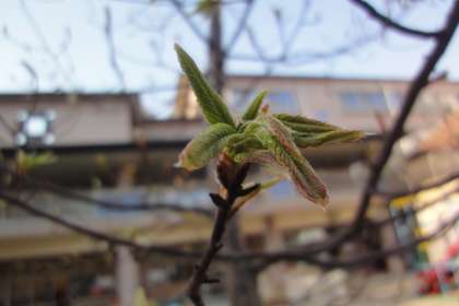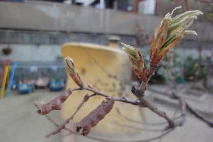 園庭には,クヌギの木があります。冬の間は枯れた葉がついたままになって,「ほんまに大丈夫かな?枯れてんのちゃうかな?」と思いながら見ていました。
