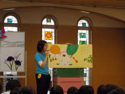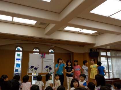 前には風車とアヤメがあるのですが,何かが足りません。みんなで「こいのぼり」の歌を歌うと・・・,色とりどりのこいのぼりが出てきました。その一つ一つに名前が書いてあり,誕生児の子どもの名前が出てきます。友達の名前が呼ばれると,見ている子どもたちも,とっても嬉しそうに手を振っていました。