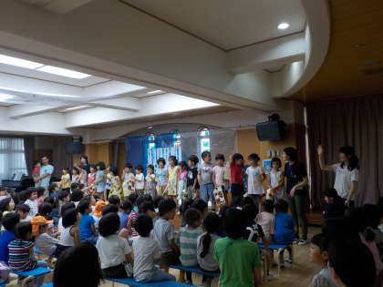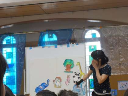 お楽しみではパネルシアターを見ました。泥だらけになってしまった動物たちが泡で体を洗っています。あわあわになっている動物たちを見て「パンダかな?」「ウサギだ!」などと言いながら楽しんでいる子どもたち。ゾウが長い鼻をつかって水をかけるときれいになった動物たちが出てきて子どもたちは大喜びでした。