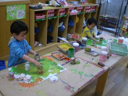 新しい画用紙をもらって,両手いっぱいに絵の具をつけて感触も楽しんで