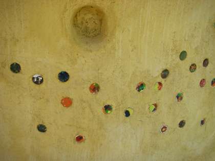 4歳児のひまわり組,たんぽぽ組が,一人ずつ色をつけて埋め込みました。