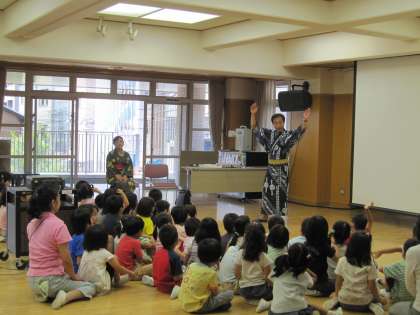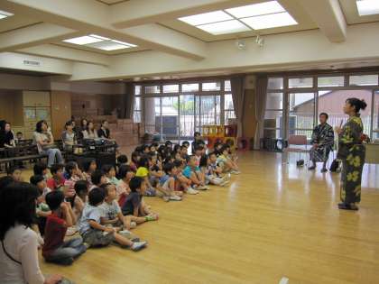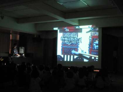学校運営協議会のテインクル委員さんに、幼稚園で祇園祭の話をききました。祭りの由来や粽のことを聞いたり、鉾について屋根のつくりや装飾品のスライドを見せてもらいました。実際に見学にいった時にきっと思い出すことでしょう。地域の方々のお陰で豊かな体験ができることに感謝です。大きくなったら鉾のお囃子をする子どもが出てくるかもしれませんね。