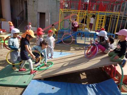 運動会で使ったフープを転がしたり,