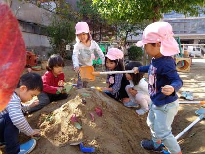 砂場で山をつくっていた3歳児たち。そこへ,4歳児が