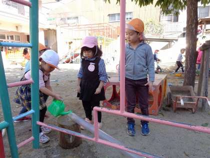早速近くにいた3歳児を呼び,ご丁寧にジョーロの水まで