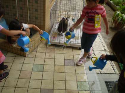4月から,抱っこしたり園庭を一緒にお散歩したり,おうちから持ってきた野菜をやったりしているうちに,すっかり子どもたちの仲間です。