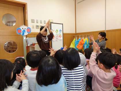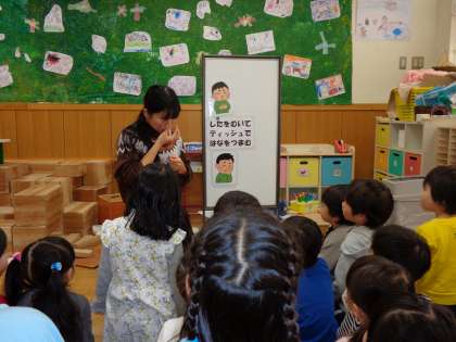 咳エチケットの話では,他の人に咳やくしゃみをかけていいのか,口元を手の平で覆いながらするのはどうかなどの質問をしながら進めると「ダメー!」という声が聞こえてきました。咳やくしゃみをするときは服の袖で口と鼻を覆うようにしてすることを伝えると,みんなでまねをしながら実践することができました。