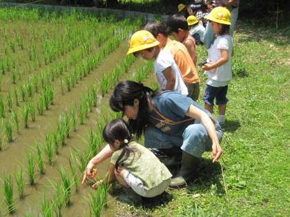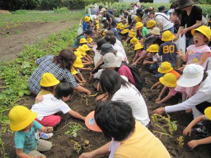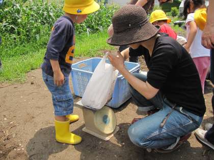 伏見にある京都教育大学の環境実践センターへ行きました。親子でジャガイモを2株掘りました。各家庭へのお土産分には1kgずつ量りましたが、多すぎた方の中には8kgも掘り上げられた親子もありました。幼稚園へもお土産に10kg購入しました。大きいコンテナの残り分を合わせるとみんなで100kg掘ったことになります。すごいですね。子どもたちはせっかく掘り上げたのを1kgだけにするときには残念そうでしたが、お母さん達が留守番の年少年長さんへのお土産だと話すと納得していました。食事の後は、田んぼやいろいろな野菜畑で遊びました。小さいエビ?やオタマジャクシを上手に捕まえられていたお母さんの周りには子どもたちの輪ができたりしていました。前日の雨で実施が危ぶまれましたが、暑いくらいの日になりました。汗をいっぱいかいて、帰りの電車の涼しかったこと、皆さんお疲れ様でした。ありがとうございました。