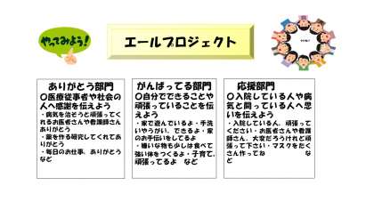 長いお休みになっています。みんな家にいて,いろいろな我慢をして過ごしているのではないかな?本当にがんばっているなと思っています。今,それはみんなの命を守るために大切なことですね。いろいろなところでみんなみんながんばっています。それを一緒にがんばろう!と思ったり,励まし合ったりしたいと考え,京都市立幼稚園15園では全園で【エールプロジェクト】を始めます。詳しくはこちらを読んでぜひ参加してくださいね。