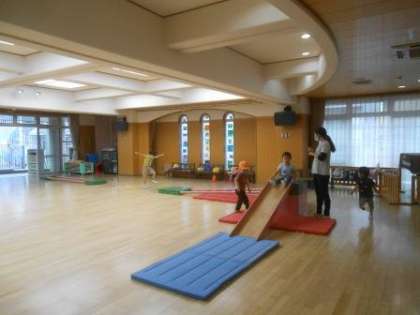 午前中は,雨が降ってきて園庭ではあまり遊べませんでしたが,遊戯室に巧技台を出し,体をいっぱい動かしではしごや一本橋の道を歩いたり,滑り台をすべったりケンパをしたりした遊んだり,絵をかいたりつくったりしたり,ままごと遊びをしたり,積み木で遊んだりと,色々なところに行って遊ぶことを楽しんでいましたよ。