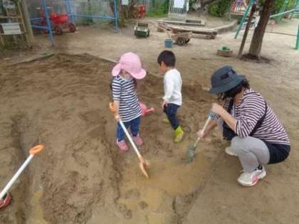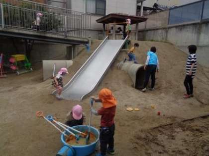 でも,周りを見てみると色々な遊ぶところがあって,楽しいかも?とお部屋でままごとあそびや電車遊び,積み木,絵をかいたりしたり,園庭や2階のテラスにも行ってみたり,様々なところに遊びに行く姿が見られました。三輪車にチャレンジしたり,ブランコやジャングルジム,滑り台で遊んだり、たくさん体を動かして遊ぶ子どもたちもいました。砂場では,ごちそうづくりドロドロづくりも楽しくなってきて,服が汚れることも気にせず,思い切り楽しむ子どもたちもいましたよ。ジョロでお花に水をあげる子どもたちもいて,色々な楽しいことを発見し,好きなことを見つけ始めていました。