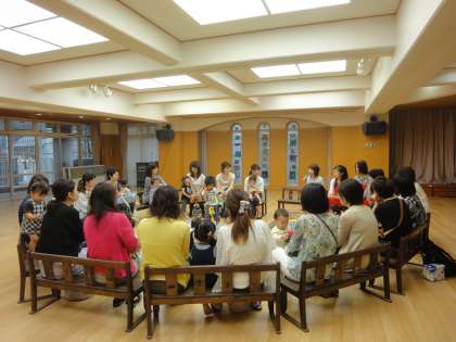 懇談は「もえぎ幼稚園に入ってよかったこと」「幼稚園入園前にしておいたほうがいいこと」などの質問が出て、現PTAのお母さんや園長がお話させていただきました。