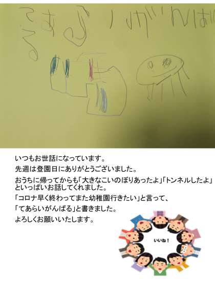 先週から希望登園日を1クラス,1時間ずつですが始めました。「また幼稚園に行きたい!」と早速おたよりをいただきましたよ。とてもうれしいです。手洗いも頑張ってるね! 素敵な絵をありがとう! いいね!