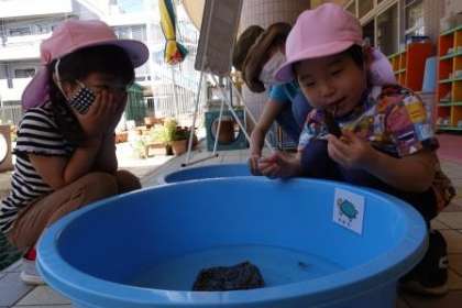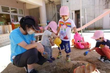 先生と一緒に砂山にジョウロやバケツなどで水を流したり、ザリガニやカメにふれたり、ウサギに野菜をあげたりして遊んでいました。