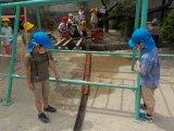 ひまわり組は朝一番からポンプで水を汲み,保育室のほうまで樋で長いコースをつくって遊んでいました。なかなか樋の接続が難しく,遠くまで水が流れなくて困っていると,すみれ組が寄ってきて,「こうしたらいいんちゃう?」「こっちを上にするとよく流れるよ!」と,アドバイスをしてくれました。すると,「こんなに遠くまで流れた!」と,うれしそうな声が聞こえてきました。クラスや学年が違っても,みんなで一緒に協力してあそぶ姿がすてきですね。